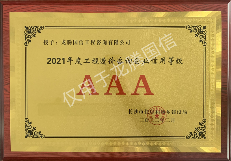 長沙市住房和城鄉(xiāng)建設(shè)局為加強工程造價咨詢行業(yè)管理,組織開展了2021年度工程造價咨詢企業(yè)市場行為誠信評價工作,我單位獲評“2021年度工程造價咨詢企業(yè)信用等級AAA”。