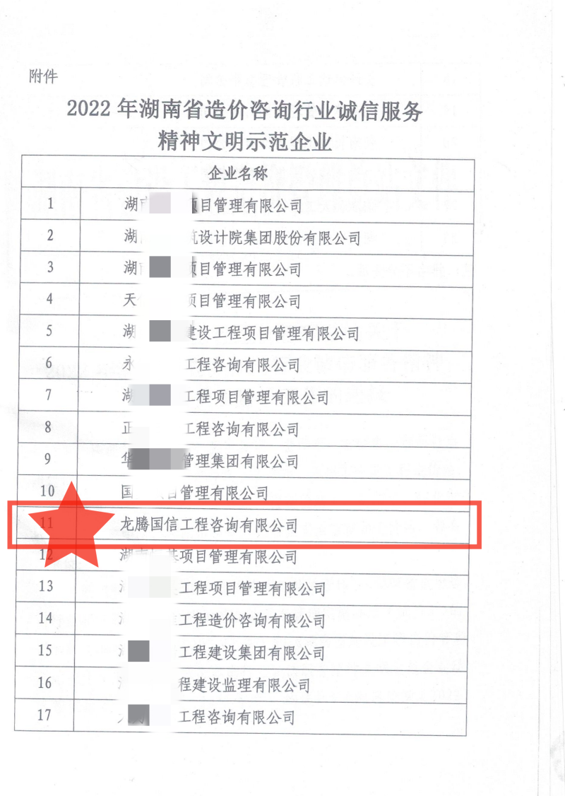 【喜報(bào)】龍騰國信榮獲“2022年湖南省造價(jià)咨詢行業(yè)誠信服務(wù)精神文明示范企業(yè)”