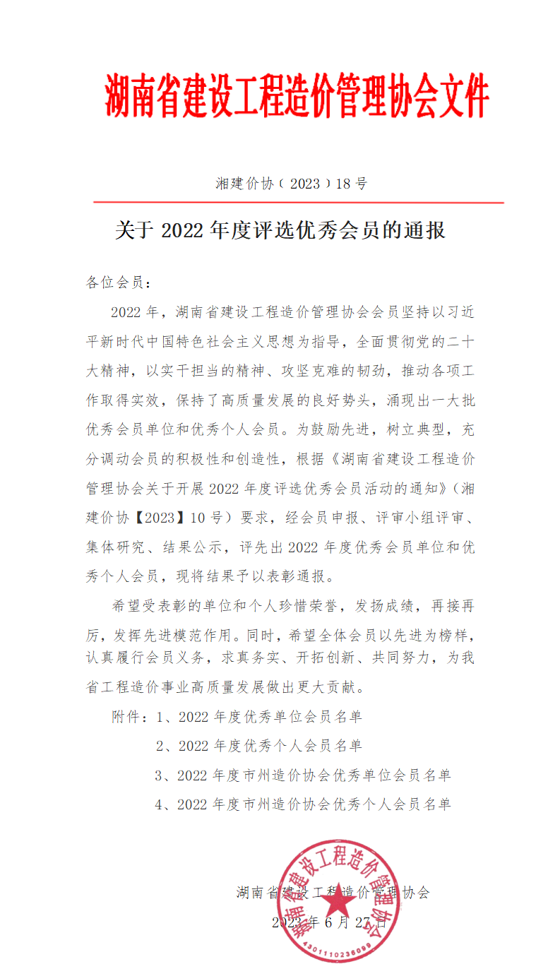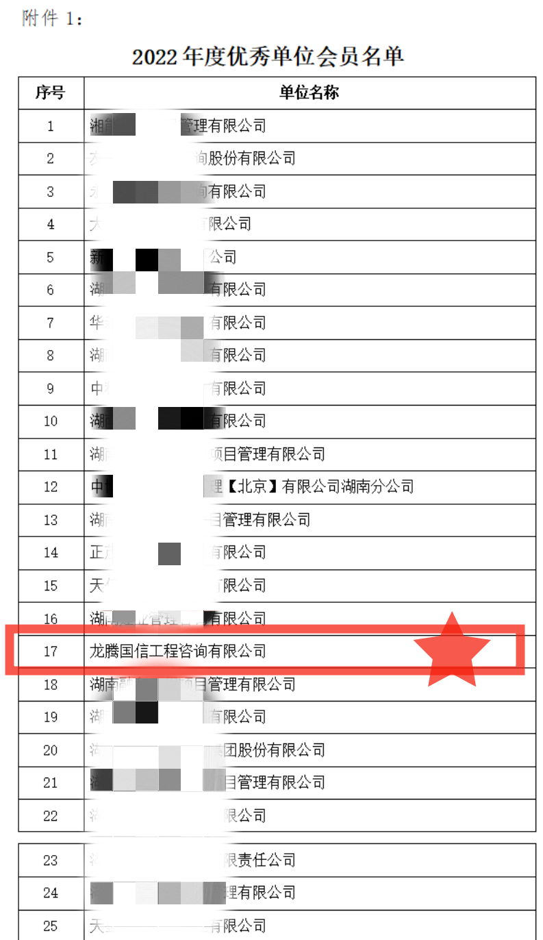 2022年,湖南省建設(shè)工程造價(jià)管理協(xié)會(huì)會(huì)員堅(jiān)持以習(xí)近平新時(shí)代中國特色社會(huì)主義思想為指導(dǎo),全面貫徹黨的二十大精神,以實(shí)干擔(dān)當(dāng)?shù)木瘛⒐?jiān)克難的韌勁,推動(dòng)各項(xiàng)工作取得實(shí)效,保持了高質(zhì)量發(fā)展的良好勢頭,涌現(xiàn)出一大批優(yōu)秀會(huì)員單位和優(yōu)秀個(gè)人會(huì)員。為鼓勵(lì)先進(jìn),樹立典型,充分調(diào)動(dòng)會(huì)員的積極性和創(chuàng)造性,根據(jù)《湖南省建設(shè)工程造價(jià)管理協(xié)會(huì)關(guān)于開展2022年度評(píng)選優(yōu)秀會(huì)員活動(dòng)的通知》(湘建價(jià)協(xié)【2023】10號(hào))要求,經(jīng)會(huì)員申報(bào)、評(píng)審小組評(píng)審、集體研究、結(jié)果公示,“龍騰國信工程咨詢有限公司”榮獲湖南省建設(shè)工程造價(jià)管理協(xié)會(huì)2022年度“優(yōu)秀單位”、公司造價(jià)工程師周燕屏獲“優(yōu)秀個(gè)人”榮譽(yù)稱號(hào)。