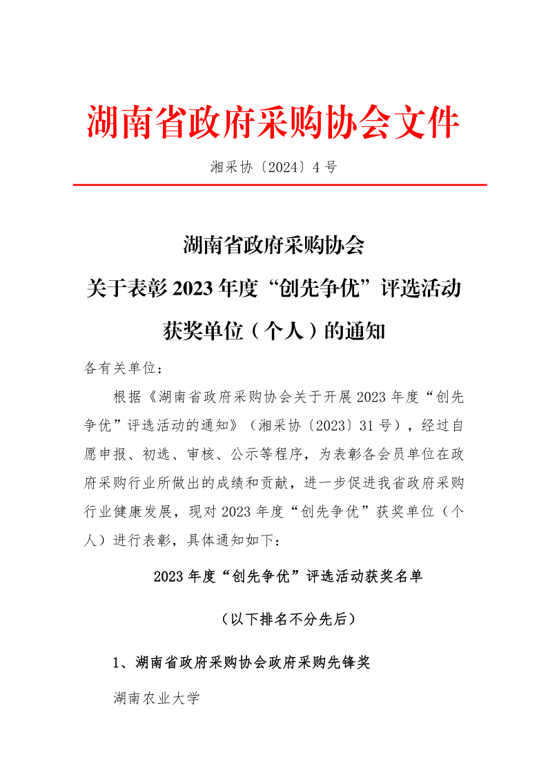 我單位獲評(píng)湖南省政府采購協(xié)會(huì)2023年度“優(yōu)秀代理機(jī)構(gòu)”