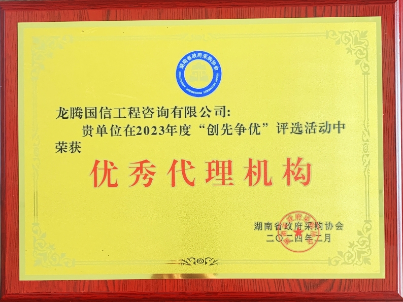 根據(jù)《湖南省政府采購協(xié)會(huì)關(guān)于開展2023年度“創(chuàng)先爭(zhēng)優(yōu)”評(píng)選活動(dòng)的通知》(湘采協(xié)〔2023〕31號(hào)),為表彰各會(huì)員單位在政府采購行業(yè)所做出的成績(jī)和貢獻(xiàn),進(jìn)一步促進(jìn)我省政府采購行業(yè)健康發(fā)展,我單位獲評(píng)2023年度“優(yōu)秀代理機(jī)構(gòu)”。