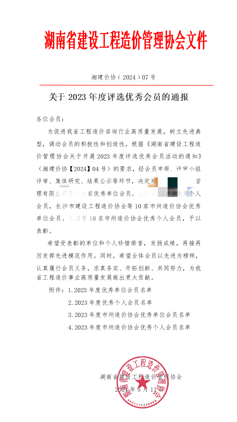 為促進(jìn)我省工程造價(jià)咨詢行業(yè)高質(zhì)量發(fā)展,樹立先進(jìn)典型,根據(jù)《湖南省建設(shè)工程造價(jià)管理協(xié)會(huì)關(guān)于開展2023年度評(píng)選優(yōu)秀會(huì)員活動(dòng)的通知》(湘建價(jià)協(xié)【2024】04號(hào))的要求,經(jīng)申報(bào)、評(píng)審小組評(píng)審、集體研究、結(jié)果公示等環(huán)節(jié),我單位被評(píng)為“2023年度優(yōu)秀單位”。