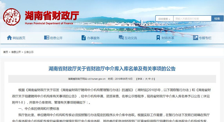 根據(jù)《湖南省財政廳關于印發(fā)〈湖南省財政廳聘用中介機構管理暫行辦法〉的通知》(湘財監(jiān)[2018]5號,以下簡稱暫行辦法)和《湖南省財政廳關于組建聘用中介機構庫有關事項的公告》,經(jīng)中介機構申請、資質(zhì)審查、名單公示等程序,我司成功入圍。