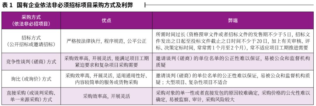 對于國有企業(yè)依法非必須招標(biāo)項(xiàng)目,可以選擇招標(biāo)方式,也可以選擇競爭性談判、競爭性磋商、詢比(或詢價(jià))、直接采購(或談判采購、單一來源采購)等方式,這些方式各有利弊,具體見表1。